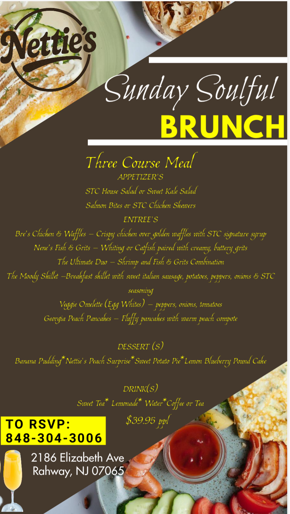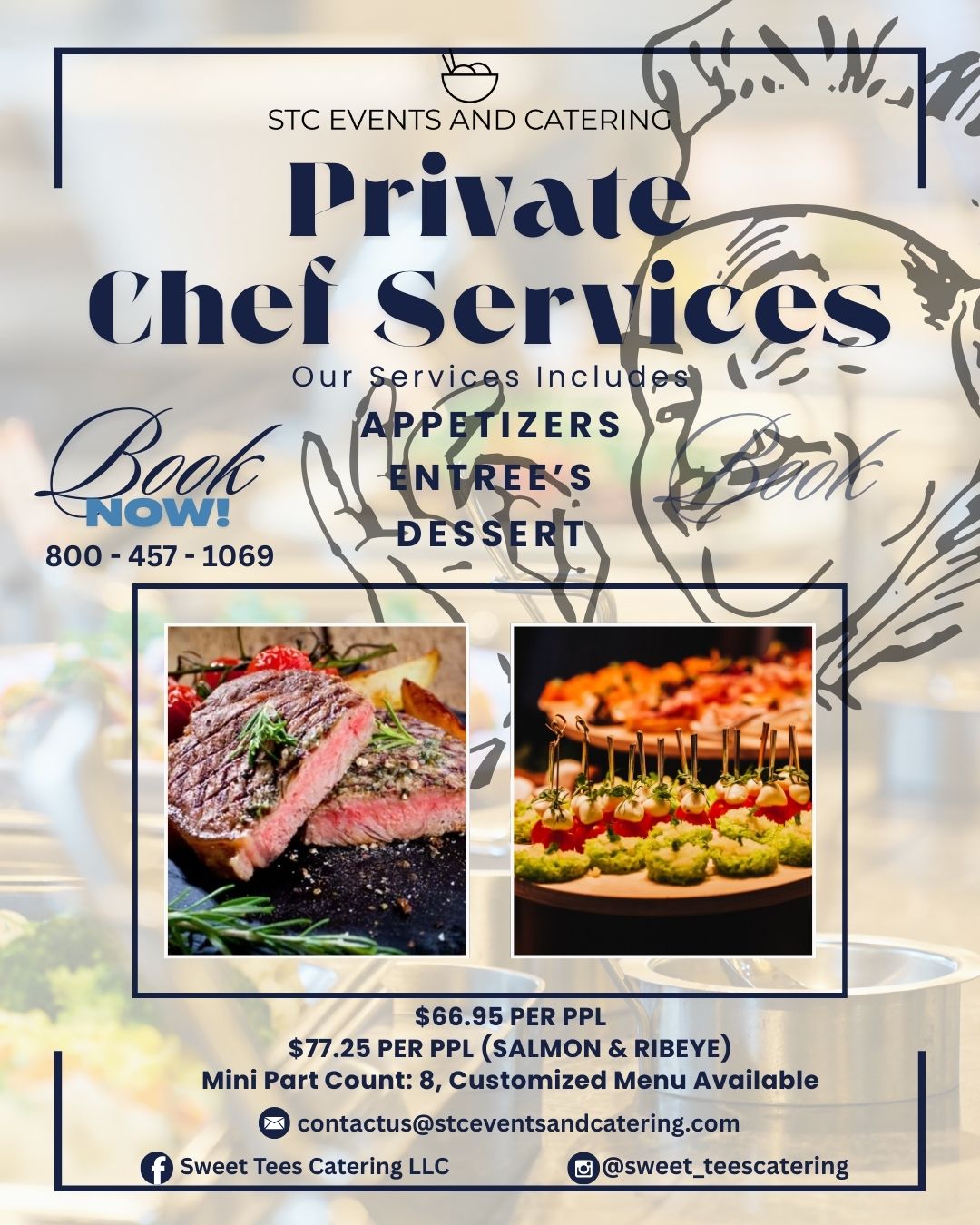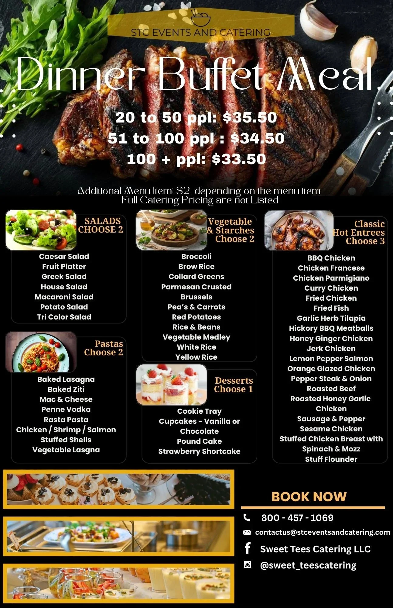 Full-service catering with customizable menus featuring appetizers, entrees, sides, and desserts. Perfect for weddings, corporate events, and celebrations of all sizes.